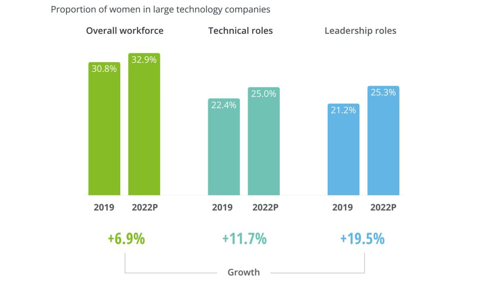 La società di consulenza gestionale Deloitte ha pubblicato un nuovo rapporto ciò dimostra che quando si tratta di rappresentanza femminile, i giganti della tecnologia stanno facendo progressi e la crescita più rapida sono state le donne in ruoli di leadership. La società ha confrontato le statistiche del 2019 con le proiezioni del 2022 basate sui rapporti sulla diversità aziendale.