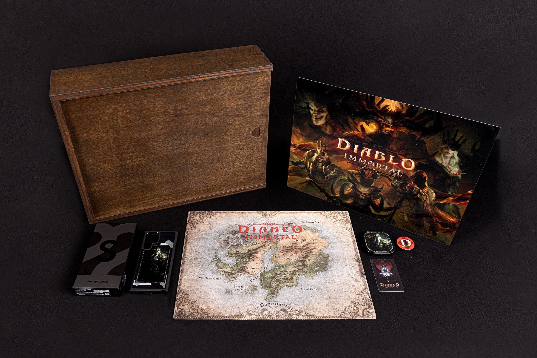 Samsung Galaxy S22 Edizione Limitata Ultra Diablo Immortal in termini tecnici non presenta differenze rispetto al modello originale, ma vanta una ricca dotazione. In un'enorme scatola di legno, oltre a uno smartphone, c'è una grande mappa del mondo di gioco, un coupon moneta da battaglia, un supporto per le dita che si monta sulla cover del telefono, oltre a un caricatore wireless, una custodia in pelle stilizzata e un tappetino per mouse in pelle.