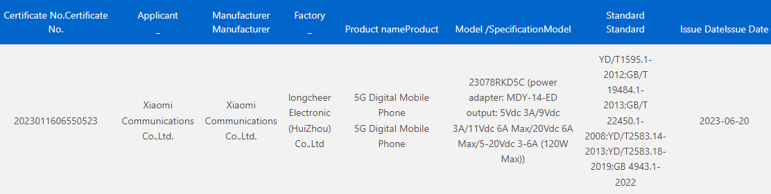 Il gadget ha il numero di modello 23078RKD5C. Secondo i documenti, la novità supporterà la ricarica rapida con 120W di potenza attraverso l'alimentatore Xiaomi MDY-14-ED.
