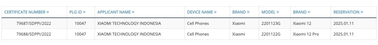 Le versioni globali dei modelli sono certificate dal regolatore Indonesia Telecom. Xiaomi 12 e Xiaomi 12 Pro si vedono sul sito web del regolatore rispettivamente con i numeri 2201123G e 2201122G. L'indice G indica che abbiamo a che fare con ammiraglie per il mercato globale.