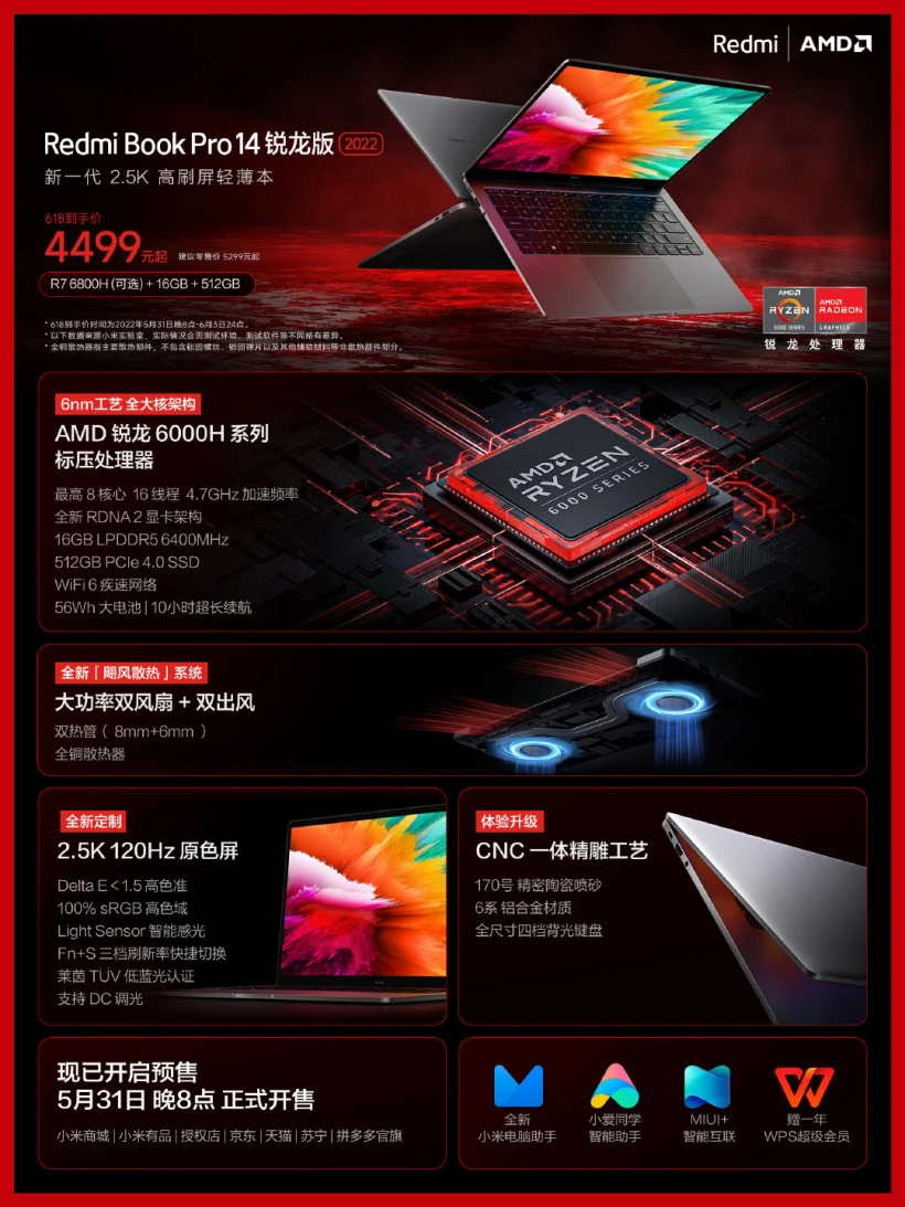 RedmiBook Pro 14 2022 costerà $ 675 con un chip Ryzen 5 6500H o $ 765 con Ryzen 7 6800H. Prezzo RedmiBook Pro Il 15 2022 senza grafica discreta era rispettivamente di $ 700 e $ 800. È necessario pagare un extra per una scheda video in entrambi i casi. $ 180.