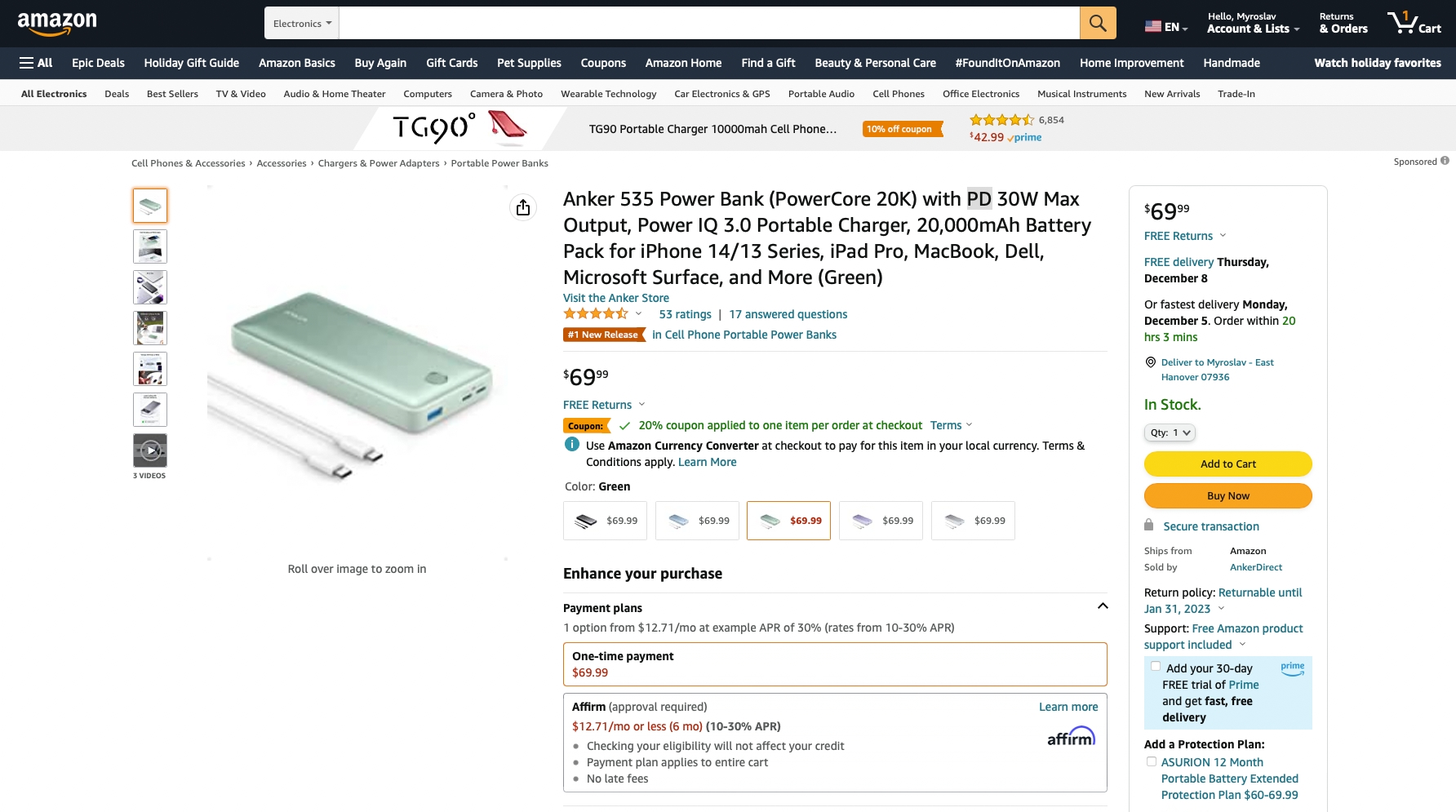 Stiamo parlando del modello Anker 535 Power Bank. Il dispositivo costa check price on amazon. Ma con un coupon il prezzo sarà inferiore di 14 dollari. La batteria ha una capacità di 20000 mAh e tre porte: una USB-A e due USB-C. Il gadget supporta lo standard Power Delivery e la ricarica massima con una potenza di 30 watt.