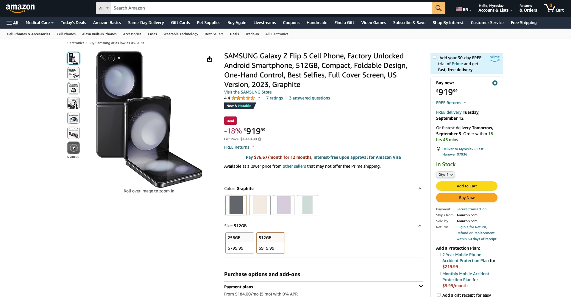 - Samsung Galaxy Flip 5, 512GB - $899.00 $1,119.99, -20%.